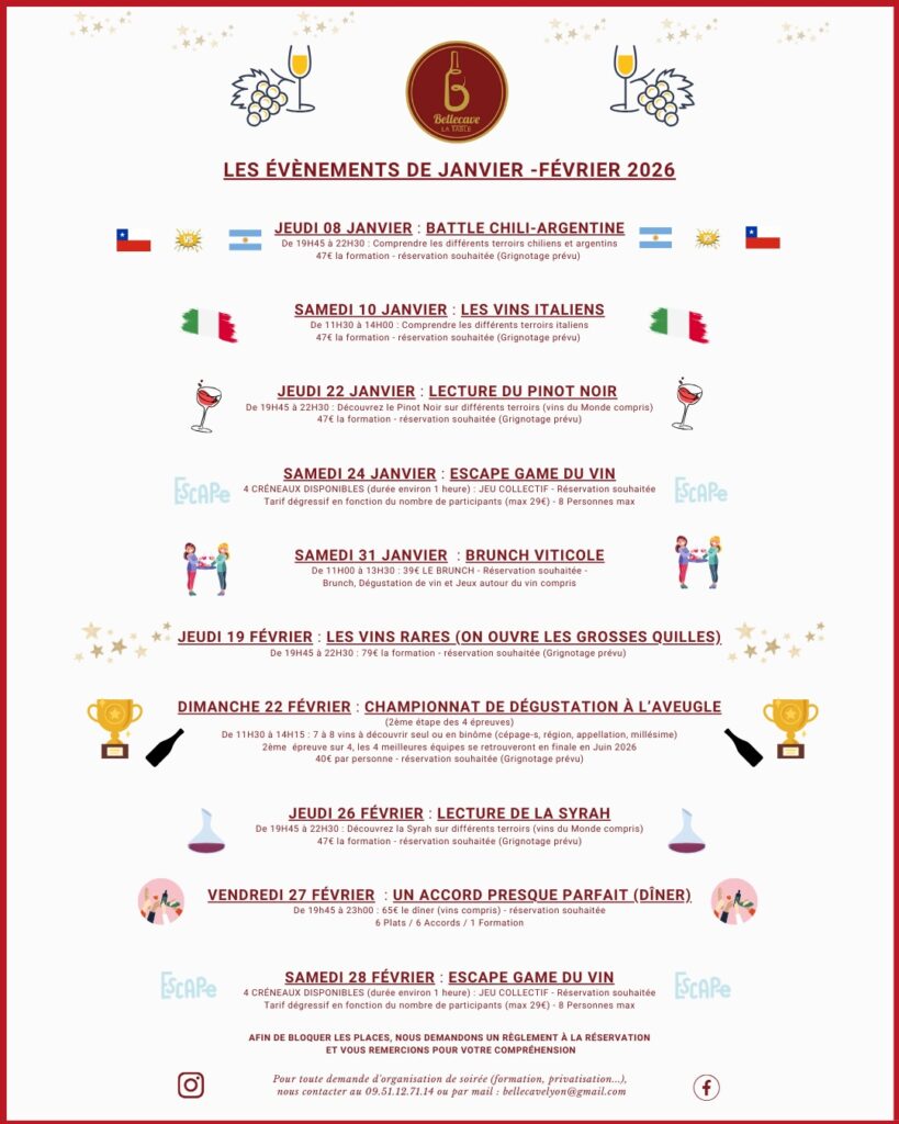 De 11H30 à 14H15: 7 à 8 vins à découvrir seul ou en binôme (cépage-s, région, appellation, millésime) 1ère épreuve sur 4, les 4 meilleures équipes se retrouveront en finale en Juin 2026 40€ par personne – réservation souhaitée (Grignotage prévu)