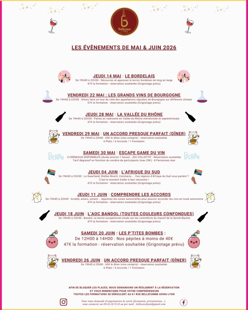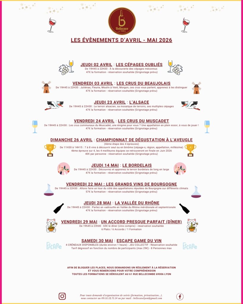 De 11H30 à 14H15 : 7 à 8 vins à découvrir seul ou en binôme (cépage-s, région, appellation, millésime) 4ème épreuve sur 4, les 4 meilleures équipes de l’année se retrouveront en finale en Juin 2026 40€ par personne – réservation souhaitée (Grignotage prévu)
